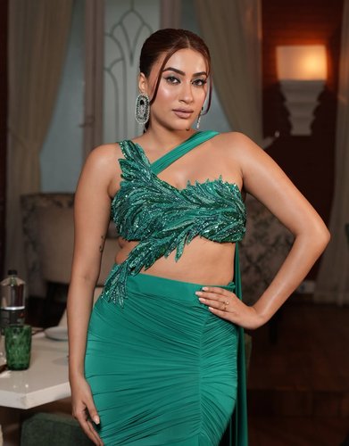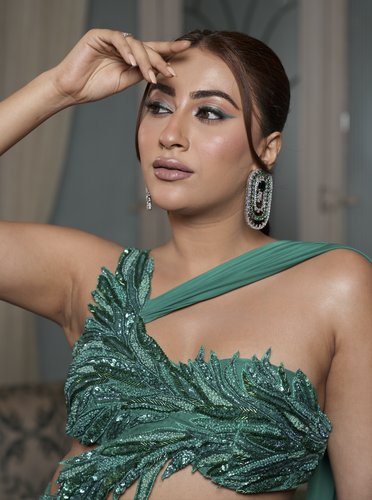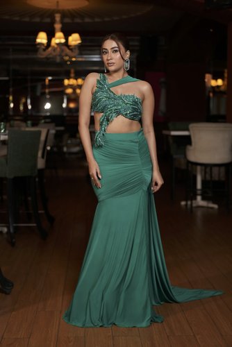Fit to flare skirt with slit, one shoulder blouse with drape.