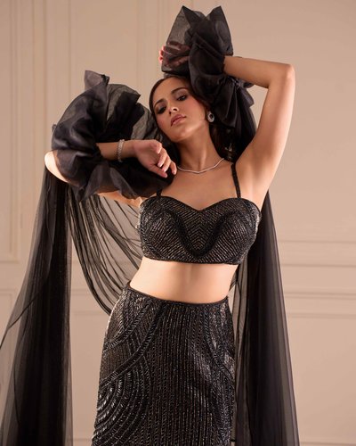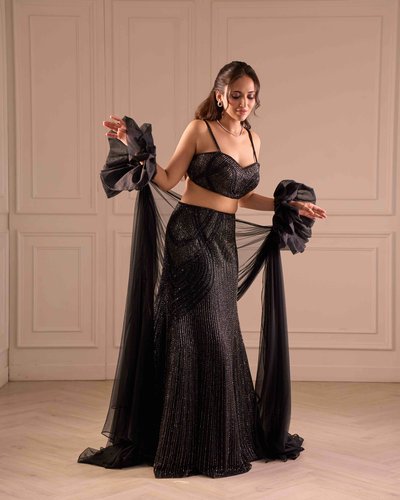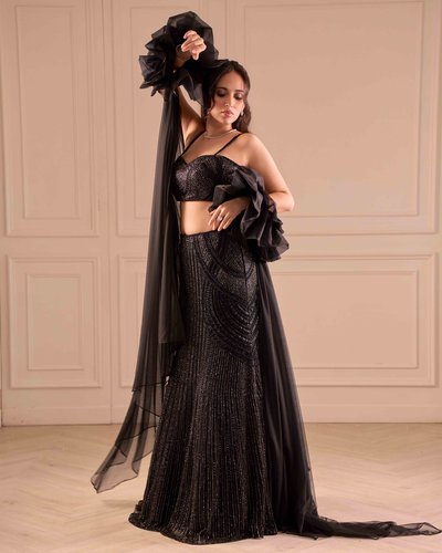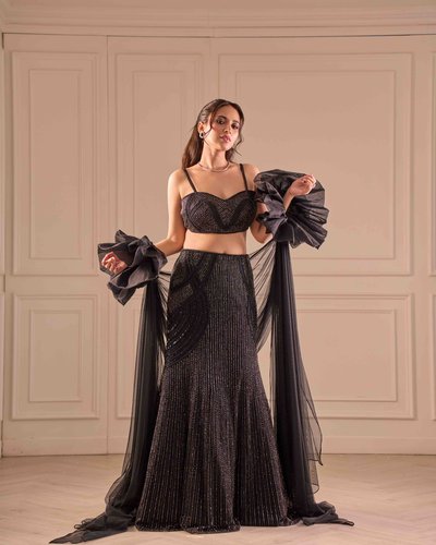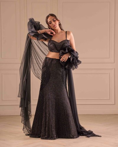 Fit to flare lehenga, tube blouse & ruffled dupatta sleeves.