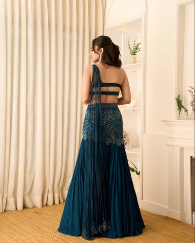 Fit & flare gathers skirt with one shoulder blouse & dupatta.