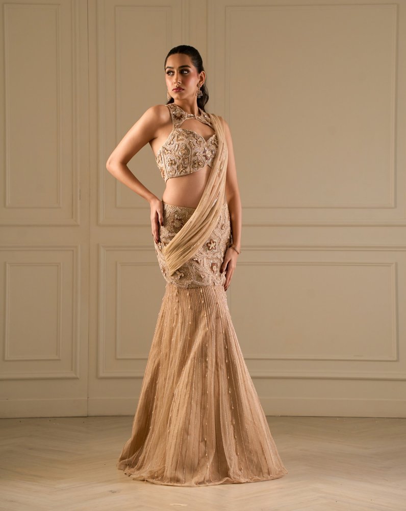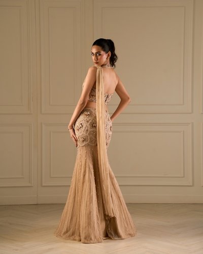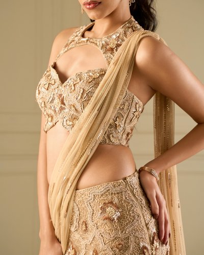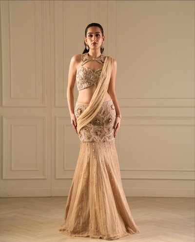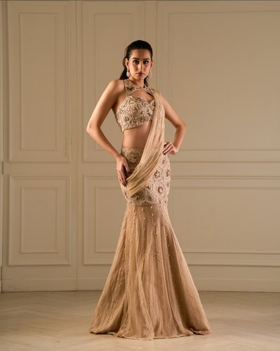 Fit to flare lehenga saree with high neck blouse.